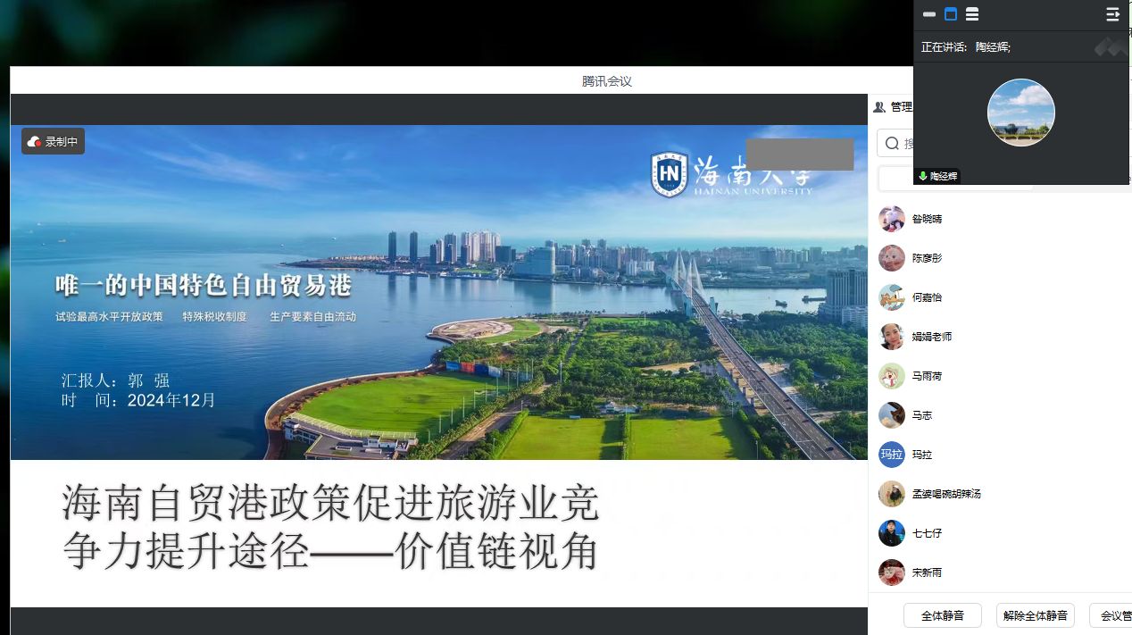 12月25日上午,应EVO真人视讯邀请,海南大学郭强教授在线作了题为“海南自贸港政策促进旅游业竞争力提升途径--价值链视角”的讲座。讲座由EVO真人视讯经理陶经辉教授主持,EVO真人视讯研究生和部分教师参加讲座。