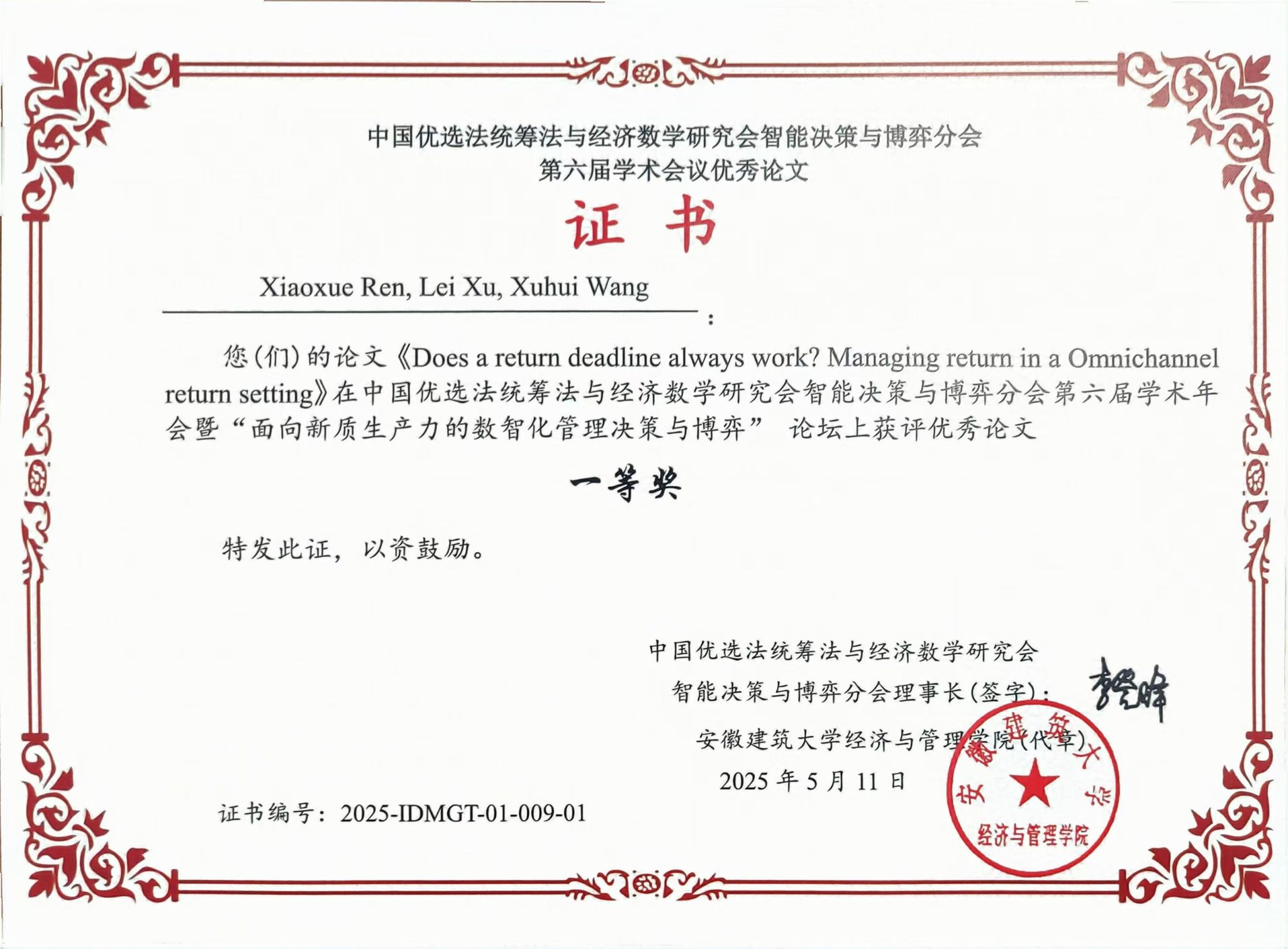 公司任晓雪老师在中国优选法统筹法与经济数学研究会智能决策与博弈分会第六届学术年会暨“面向新质生产力的数智化管理决策与博弈”论坛上获评优秀论文一等奖。