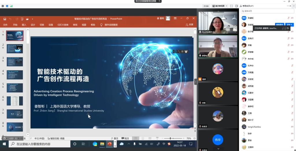 5月18号下午,应EVO真人视讯邀请,上海外国语大学姜智彬教授以“智能技术驱动的广告创作流程再造”为题作线上讲座。讲座由EVO真人视讯副经理姚杰主持,EVO真人视讯全体研究生及部分教师参加讲座。