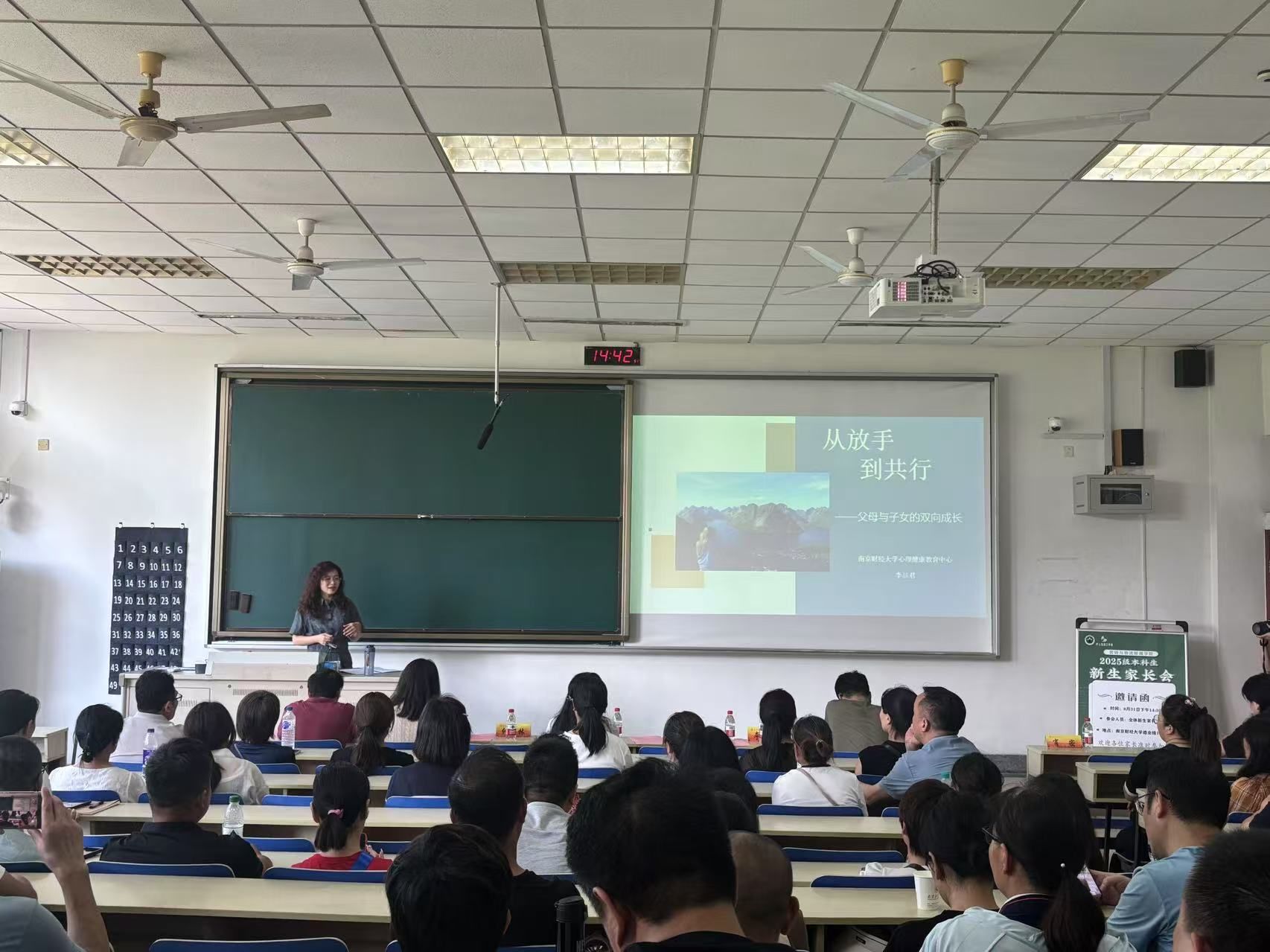 公司特别邀请了校心理健康与教育中心科长李喆君老师,围绕新生心理适应,以“从放手到共行——父母与子女的双向成长”为主题,结合现实案例,为家长提供了实用有效的心理调适方法和沟通技巧,帮助家长更好地支持孩子度过大学适应期。