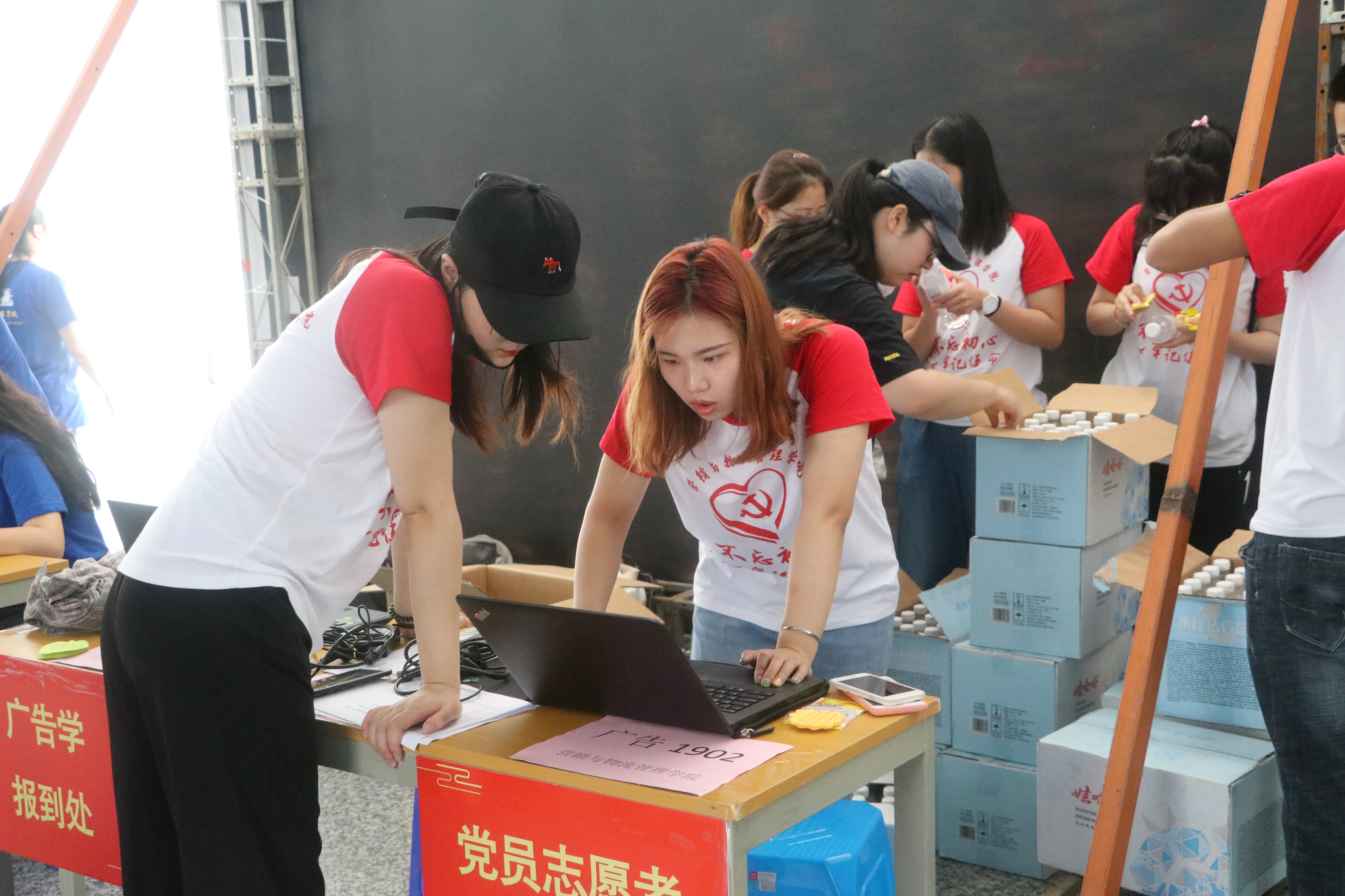 营销公司专门设立了老员工党员志愿者服务台,引导新生完成报到流程,帮助新生搬运行李,介绍校园环境和老员工活经验。