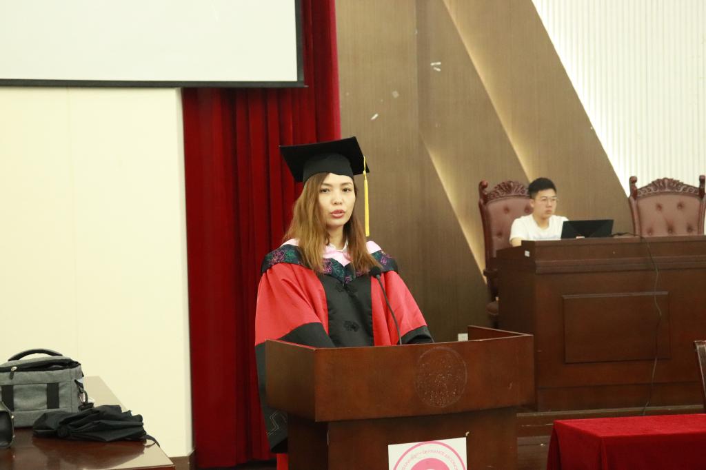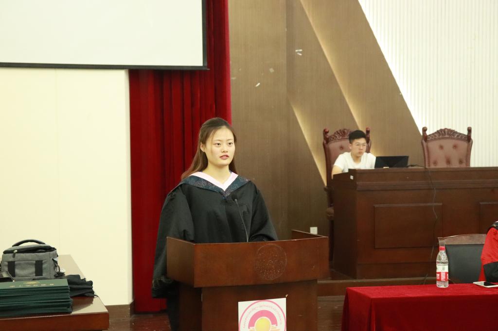 优秀毕业生代表、营销1501班赵媛媛同学代表全体毕业生发言,她对母校的栽培和师长的恩德表达了深深的感激之情,并分享了在南财大学习生活的美好回忆。她衷心祝愿母校的明天更加蒸蒸日上、灿烂辉煌。并表示2019届毕业生们将带着自谦自信,务实超越的校训服务社会,贡献国家,不懈奋斗!