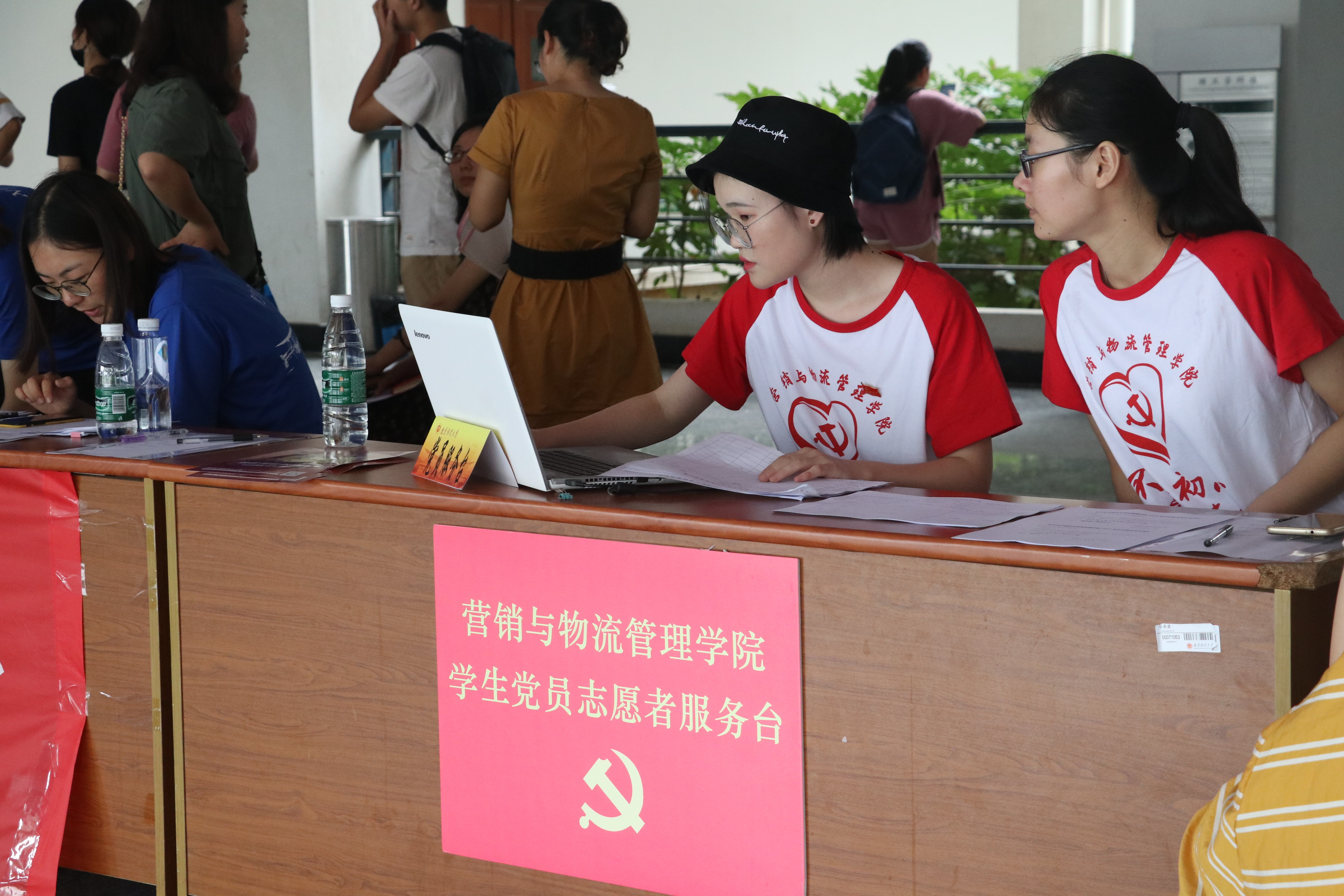 营销公司专门设立了老员工党员志愿者服务台,引导新生完成报到流程,帮助新生搬运行李,介绍校园环境和老员工活经验。