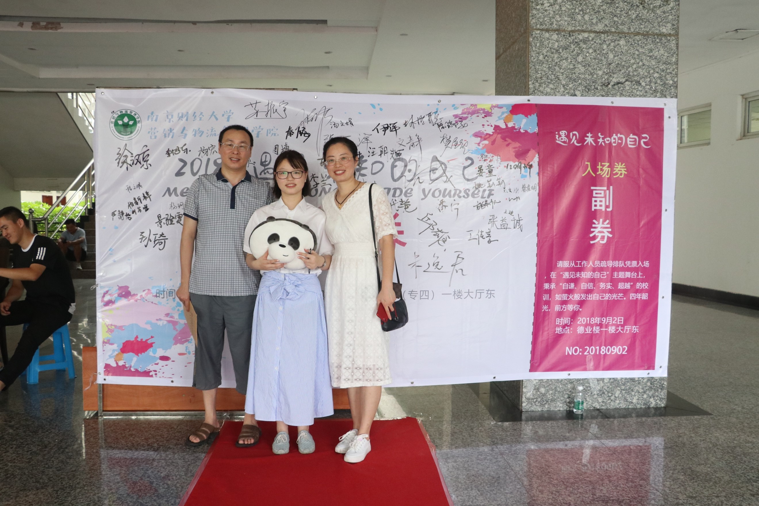 在德业楼一楼东大厅迎新现场,营销公司将迎新彩喷的形式设计为入场券,寓意着他们将踏上人生中一个新的舞台,而主题是遇见未知的自己,在遇见未知的自己主题舞台上,秉承“自谦自信,务实超越”的校训,如萤火般发出自己的光芒,去探索未知。