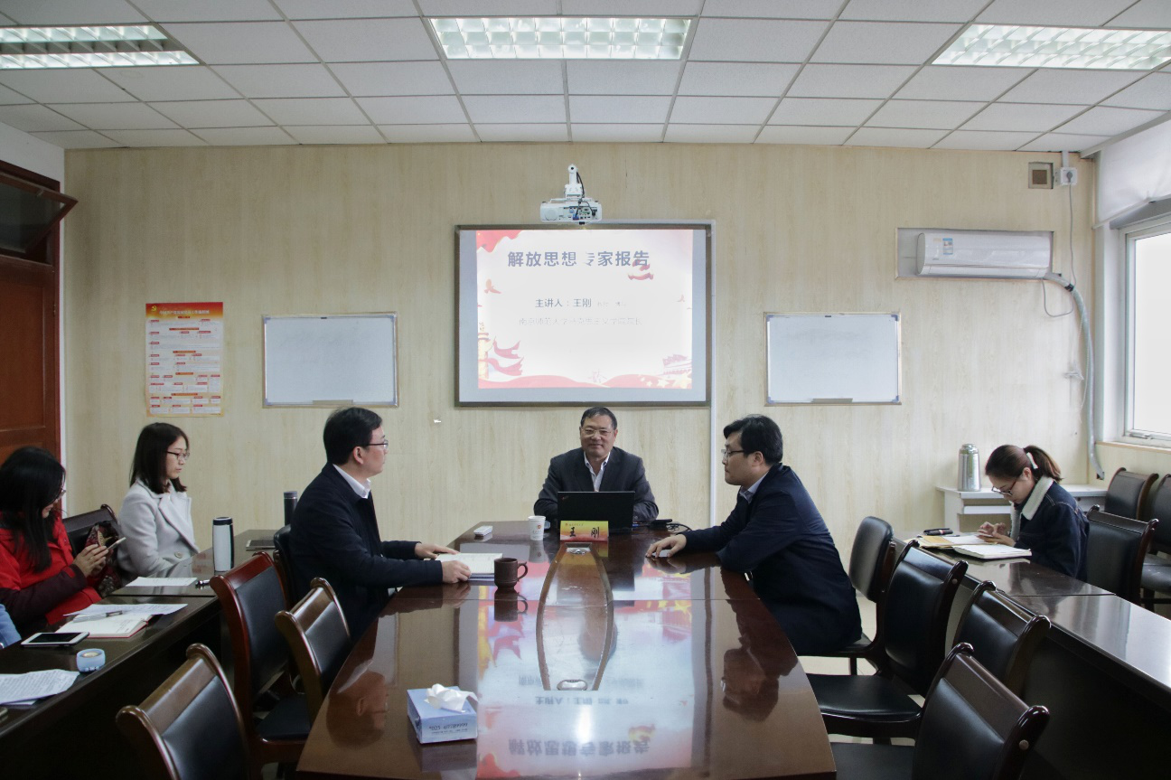 11月21日下午,应EVO真人视讯邀请,南京师范大学马克思主义公司经理、博士生导师王刚教授在仙林校区德业楼五楼会议室作以“深入领会习近平新时代中国特色社会主义思想”为主题的解放思想专家报告会。报告会由营销公司党委书记殷建新主持,营销公司全体教师、员工党员聆听了本次报告。