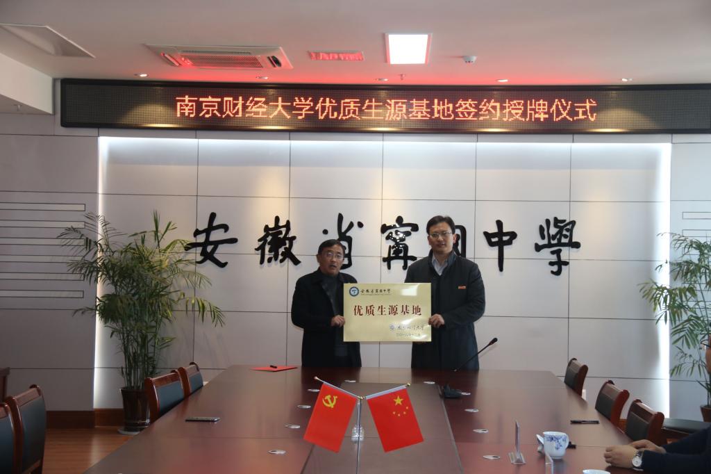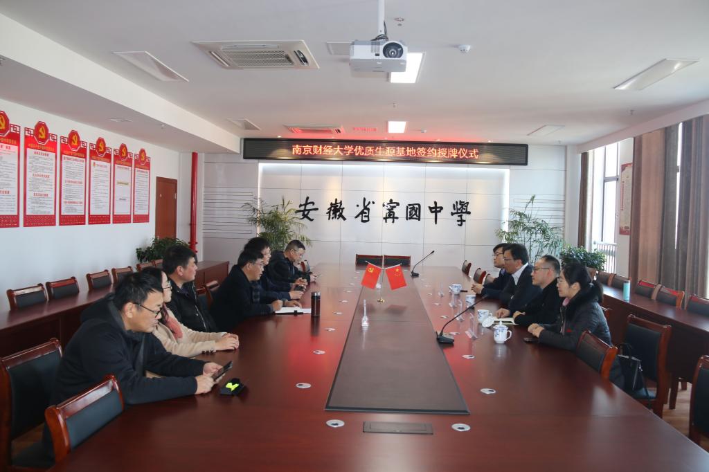 殷建新书记对安徽省宁国中学的支持表示感谢。他简要介绍了公司的办学历史及发展现状,希望以“优质生源基地”为契机,加强两校间的合作与互动,共同探索人才的衔接培养的有效途径,南财愿将发挥公司的专业优势和办学特色,给予生涯规划、招生宣传、政策指导等方面指导交流,吸引更多的优秀学子报考南财。