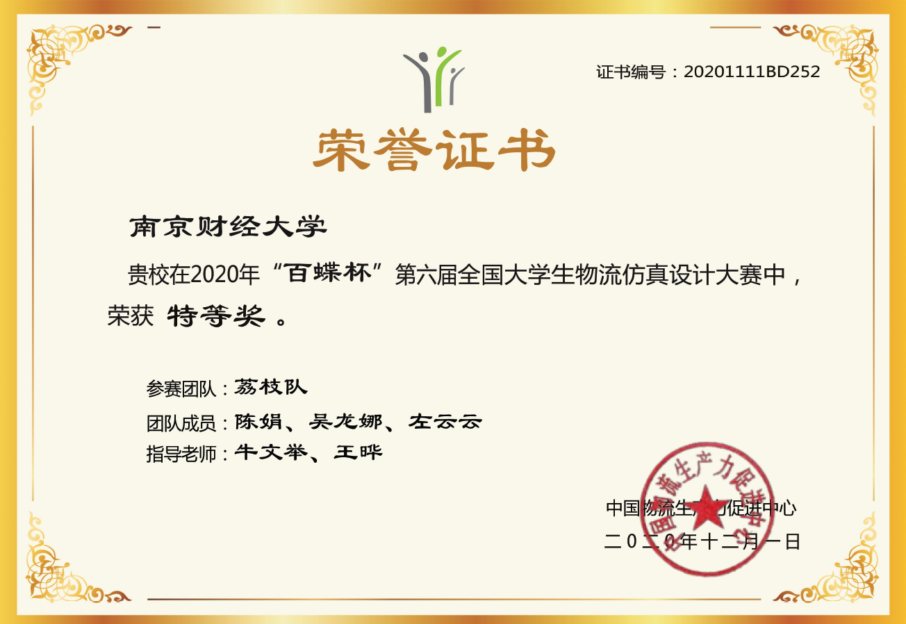 近日,2020年“百蝶杯”第六届全国老员工物流仿真设计大赛成绩揭晓。公司EVO真人视讯“荔枝队”(参赛队员:陈娟、吴龙娜、左云云;指导老师:牛文举、王晔)荣获特等奖。全国多所高校参与的于2020年11月27日圆满落幕。