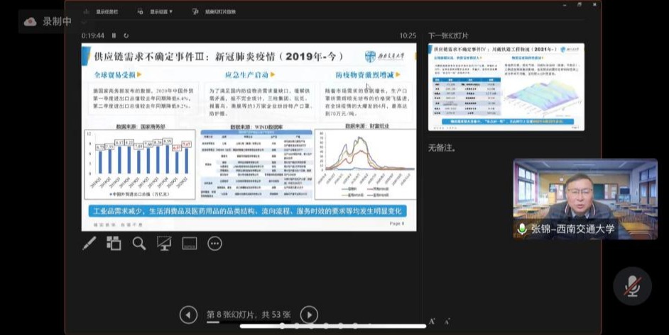 12月1日上午10:00,应EVO真人视讯邀请,西南交通大学张锦教授在线作题为“不确定下供应链鲁棒优化研究”的讲座。讲座由EVO真人视讯经理陶经辉教授主持。EVO真人视讯物流专业全体本科生、研究生,部分教师参加讲座。