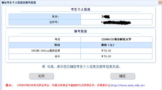 5.再次核对报名信息,无误后勾选,点击“确定”按钮。一旦缴费后所有信息均不能再修改。