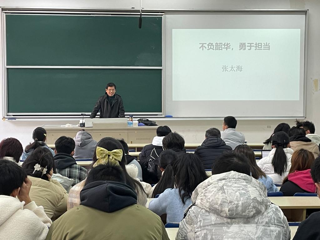 张太海教授运用风趣的语言向同学们分享了自己读大学的经历,帮助同学们加强对大学的意义进一步深入认识和了解,并通过周恩来、茅以升等立志故事向同学们提出了要努力树立大目标、掌握大学问、实现大担当等方面的要求。他带领同学们重温了习近平总书记对新时代青年的要求,希望同学们要坚定理想信念,拥有远大抱负;要树立科学的目标,合理制定学习计划;要勇于尝试,积极参与社会实习实践,于实践中增长学识与才干;要怀抱梦想又脚踏实地,敢于吃苦,甘于奉献,肩负起新时代赋予的重任。