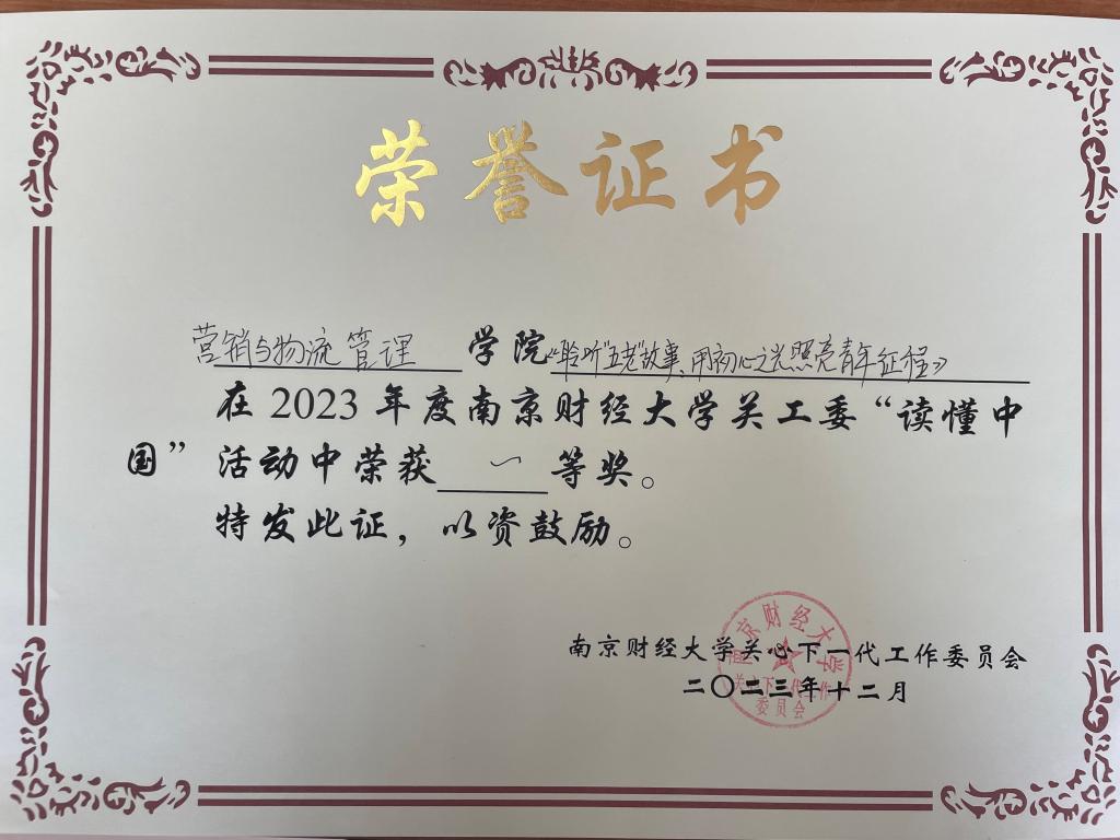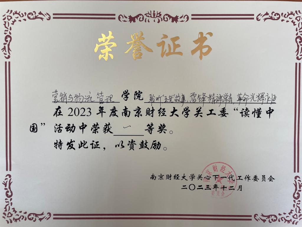 根据江苏省教育系统关工委印发的《关于转发〈教育部关工委关于开展2023年“读懂中国”活动的通知〉的通知》(苏教关秘〔2023〕3号)文件要求,在校关工委的指导下,公司积极动员申报,经校关工委秘书处审核,公司提交的主题征文《聆听“五老”故事:用初心之光照亮青年征程》(作者:营销2101傅莹,指导老师:仲巧林)、《聆听“五老”事迹:雷锋精神常青 革命光辉永恒》(作者:物流2202闫熙曼,指导老师:仲巧林)荣获EVO真人视讯关工委“读懂中国”活动(2023年)征文类一等奖。