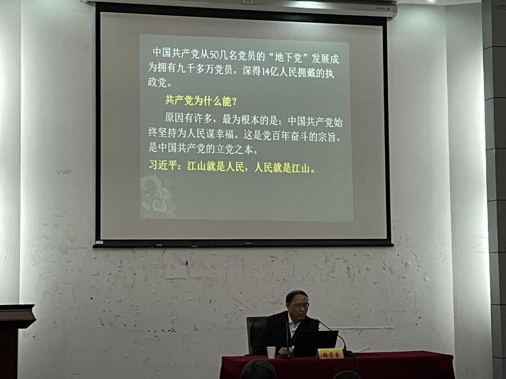 胡连生教授以“中国共产党以为人民幸福为己任”为主题,对中国共产党一百年波澜壮阔的光辉历史作了系统深入的解读。首先指出如今的中国相比于上个世纪已经发生了翻天覆地的变化,“中国制造”早已享誉全球,当今的中国,在以习近平同志为核心的党中央的坚强引领下,已经成长为足以屹立于世界大国之林的强盛之国。接着,胡教授讲到,中国共产党的初心和使命就是为人民谋幸福;中国共产党这一百年的历史,就是全心全意为人民奋斗和服务的一百年。例如土地革命时期,共产党提出了“打土豪,分田地”的口号,极大程度上满足了农民希望得到土地的愿望;抗战时期,“抗日救国,实现民族独立”更是深入人心;新中国成立之后,四个现代化的提出大大提高了我国的工业水平;改革开放的春风吹到了全国各地,不仅是对政策、经济的一次重大突破,更是对“人民当家作主”的深刻理解与实践。