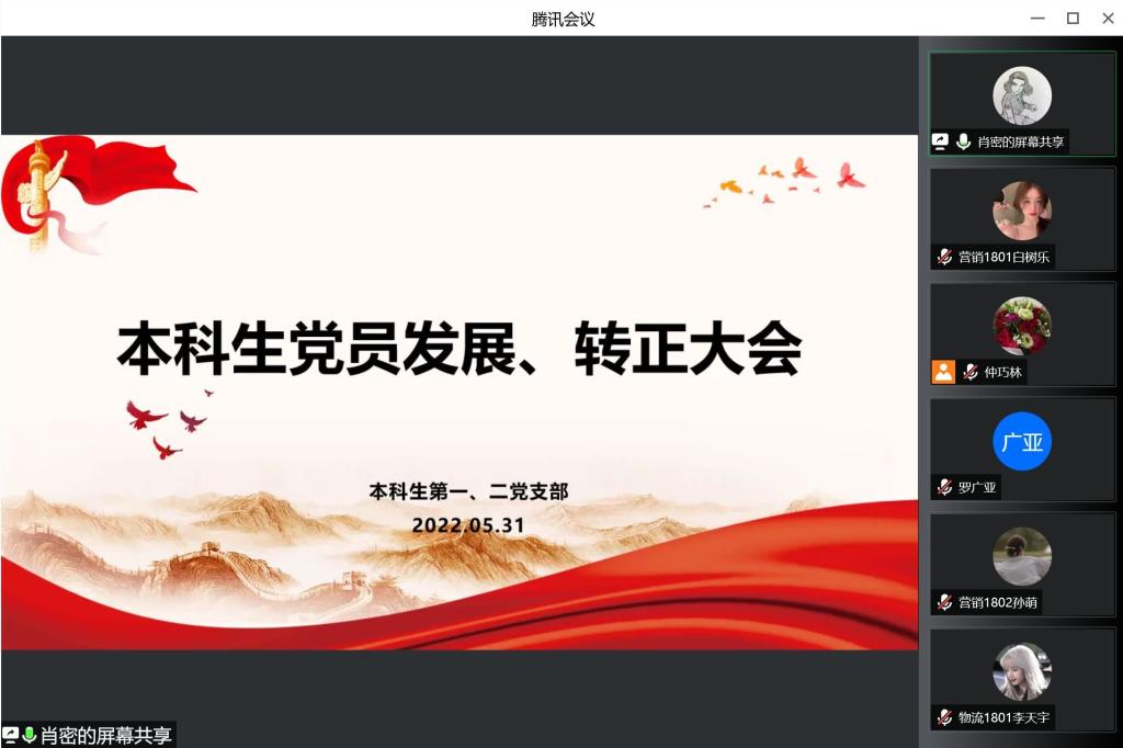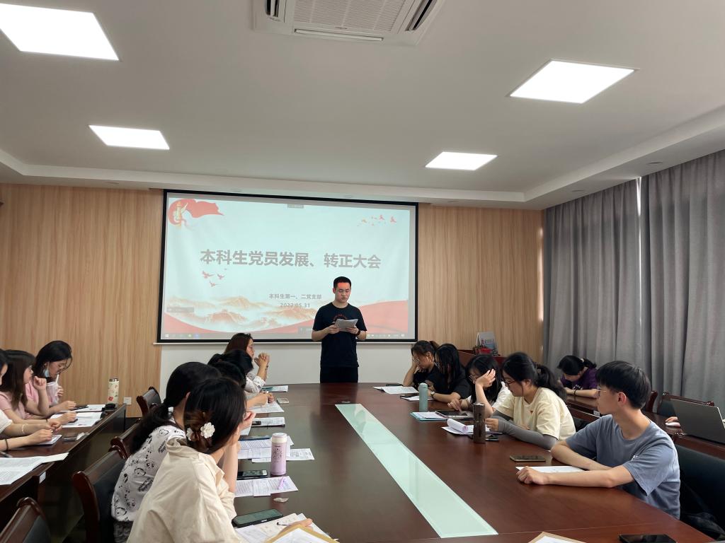 5月31日下午,EVO真人视讯本科生第一党支部、本科生第二党支部于德业楼539召开党员发展及转正大会。会议以线上线下形式同步进行,本科生第一党支部书记仲巧林,本科生第二党支部书记肖密及全体党员参加。大会由仲巧林老师主持。