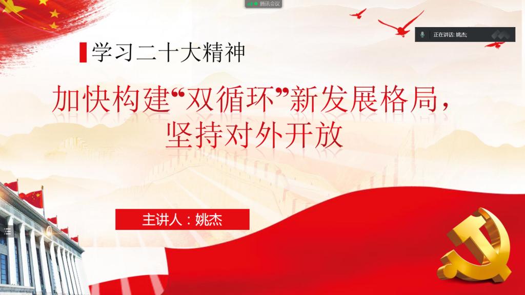 此外,姚杰老师在如何构建高水平的双循环新发展格局指出,需要推动国内国际双循环相互促进,进一步开放市场,用中国庞大的市场推动国际循环。最后,针对双循环经济体系所面临的机遇和挑战,姚杰老师总结道我们需要锻长板,补短板,才能构建“大循环”格局的实现。这对员工党员也是一种启发,在学习和工作中也需取长补短,从而能更快进步成长。