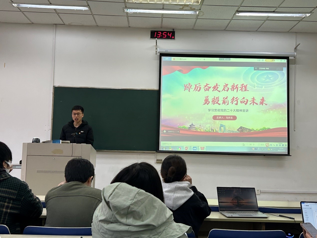 为深入学习党的二十大精神,3月22日,EVO真人视讯本科生第一党支部在德业楼102教室开展“踔厉奋发启新程,勇毅前行向未来”党的二十大精神专题宣讲。本次宣讲由公司“薪火”讲师团成员、员工党员马伏生主讲,本科生第一、第二党支部全体党员参与。