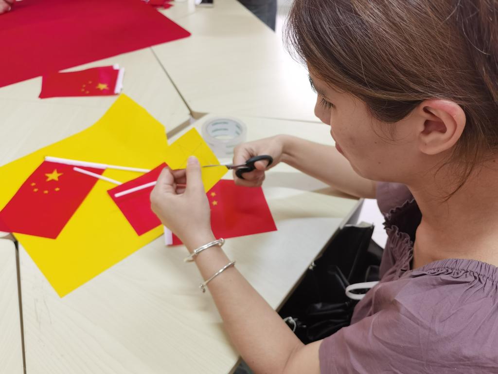 活动现场,首先,党员们一起开展了“学好党的历史,讲好红色故事”宣讲,同学们聚精会神。宣讲后,大家认真按照步骤,一边折纸、一边裁剪,你帮我、我帮你,一张张红纸变成了一面面鲜红的五星红旗。殷红的纸上醒目的黄色五角星与大家赤诚的党心相互辉映。大家拿起五星红旗纷纷对祖国表白:“祝祖国生日快乐”、“祝祖国繁荣昌盛、国泰民安”,一句句祝福饱含了全体员工党员对祖国的深情与热爱。
