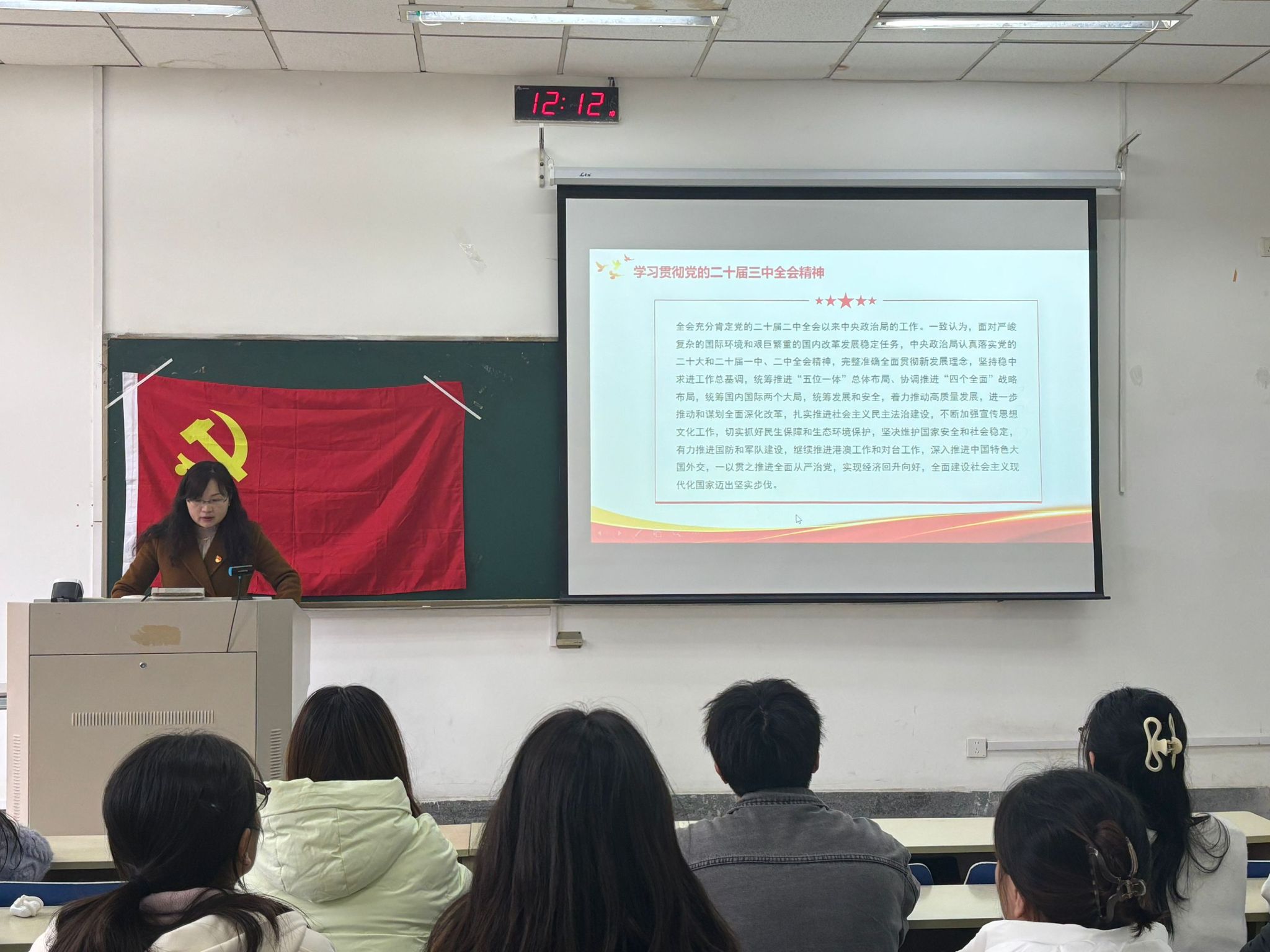 11月20日下午,EVO真人视讯本科生第二党支部政治辅导员、公司党委书记刘颖在德业楼102讲授学习贯彻党的二十届三中全会精神专题党课。本科生第二党支部全体党员参加活动。活动由党支部书记肖密主持。
