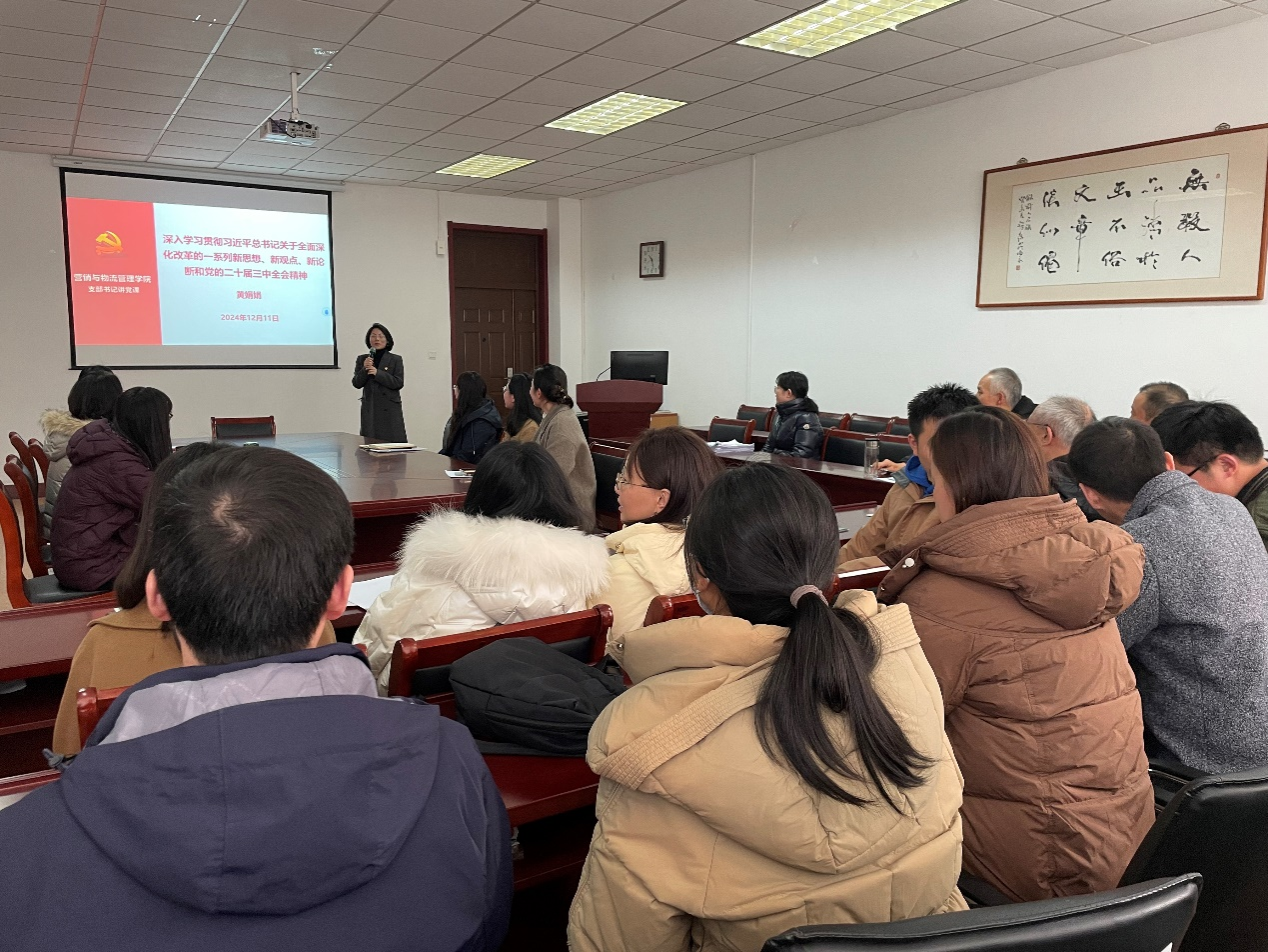 12月11日下午,EVO真人视讯教工党支部书记黄娟娟在德业楼407会议室主讲了一场以“深入学习贯彻党的二十届三中全会精神”为主题的党课,公司党委书记刘颖、党委委员姚杰、温欣及全体党员参加活动。