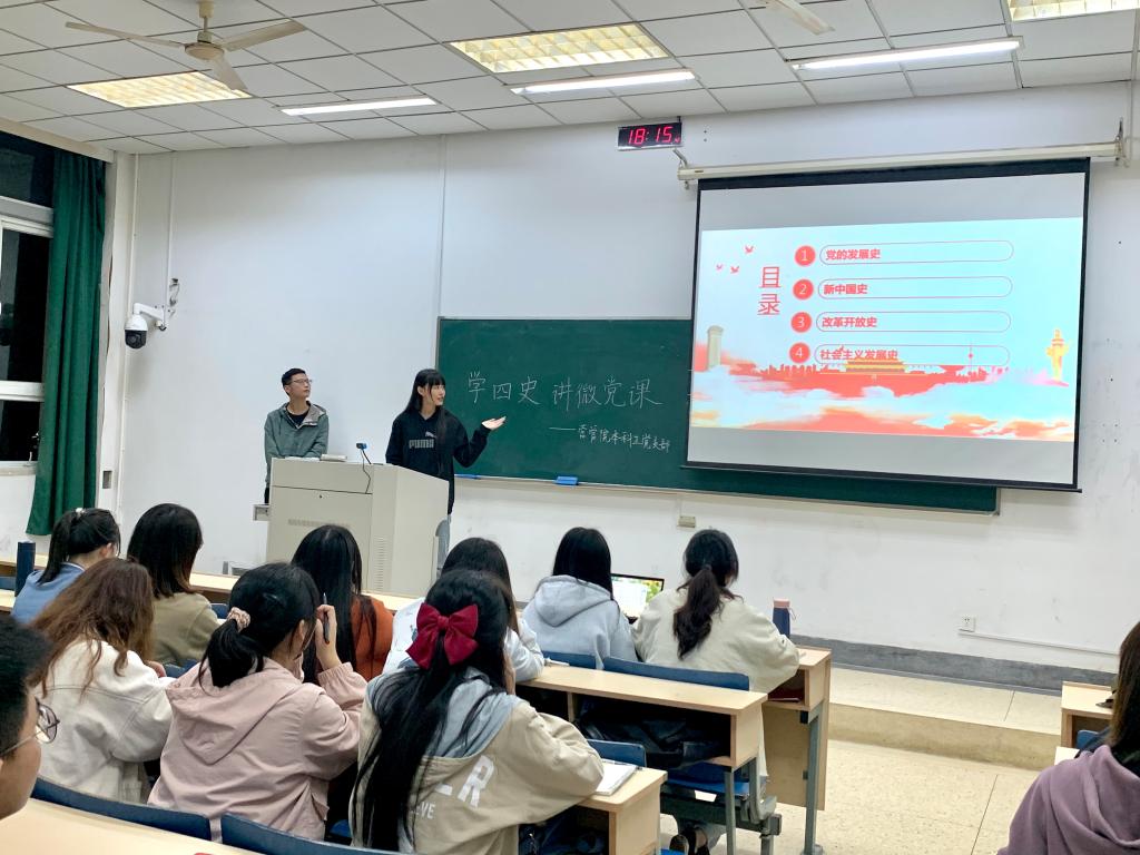 10月29日晚,公司党课培训第九讲——“学四史,讲微党课”活动在德正楼105准时开始。公司本科生党支部正式党员广告1702班张蕾同学为大家进行了引导讲话,她讲述了此次活动的主旨是为了促进党的发展对象更加了解党,培养大家知史爱党、知史爱国。