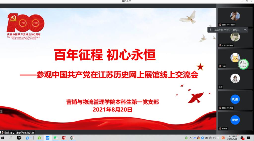 为深入开展党史学习教育,增强支部党员的党性教育,EVO真人视讯本科生第一党支部通过支部群、网络会议等形式组织党员自行参观“百年征程 初心永恒——中国共产党在江苏历史展”网上展馆。8月20日下午,支部全体党员通过网络平台集中在线参观展馆,并展开交流讨论,分享观后感悟,实现集中学与自主学相结合、相促进。