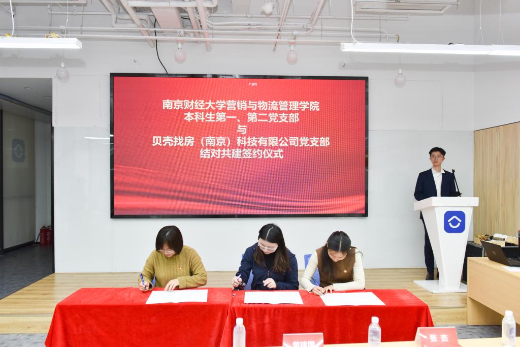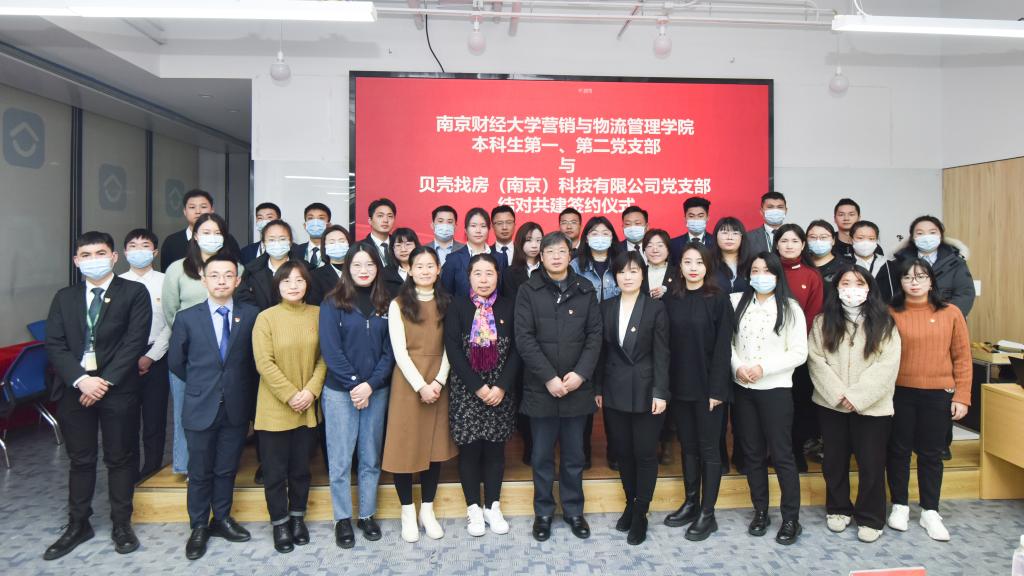 EVO真人视讯本科生第一、第二党支部和贝壳找房(南京)科技有限公司党支部共同签署党建结对共建协议,并合影留念。