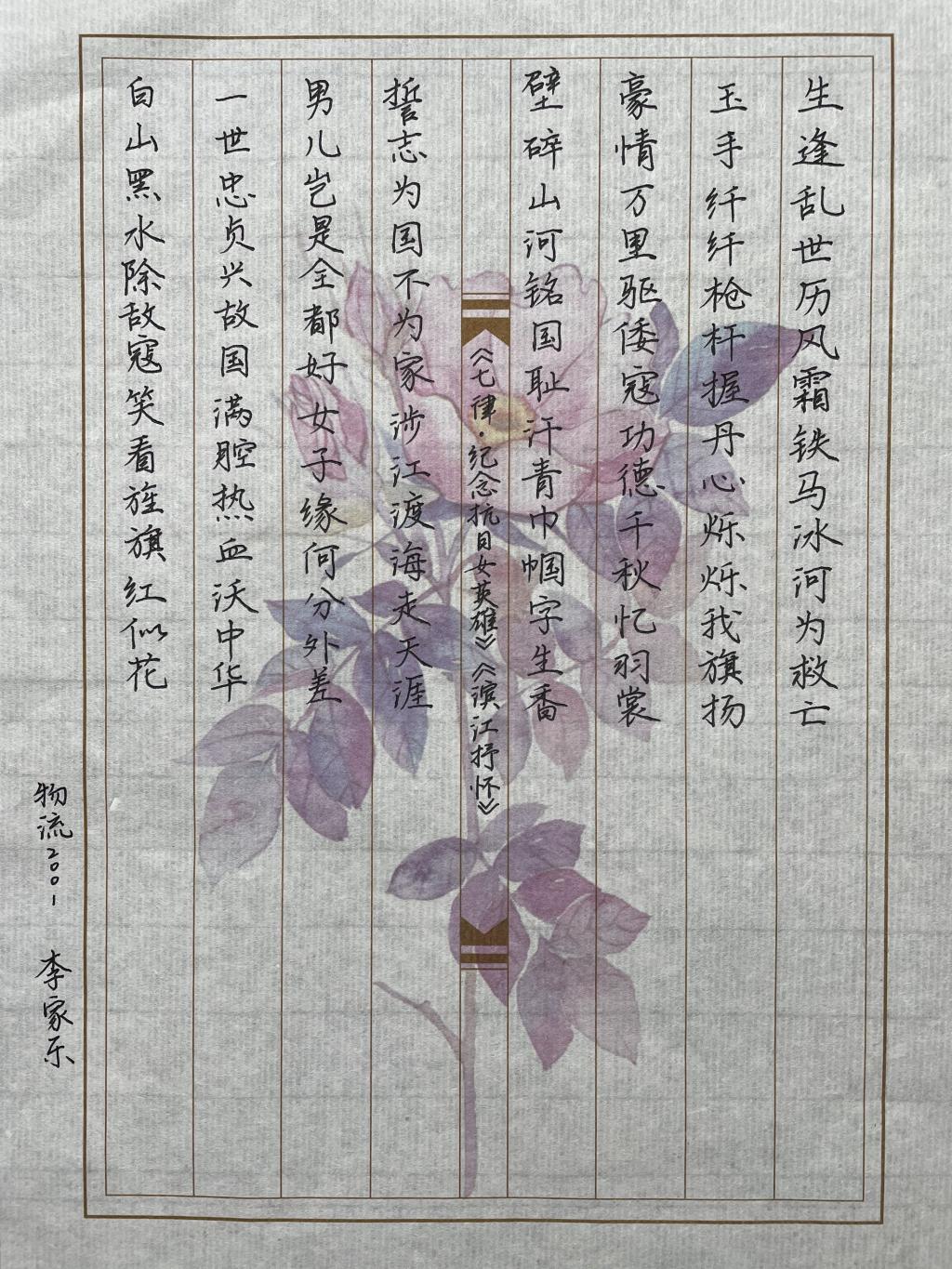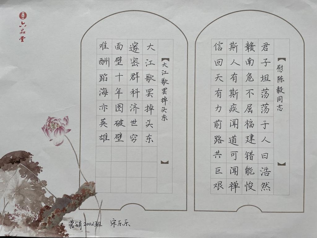 营销2002班宋乐乐所摘抄的周恩来的《大江歌罢掉头东》,表现周恩来为革命付出的豪气与为国为民族的革命初心;物流2001班李家乐所书写的赵一曼的《滨江抒怀》,表现了诗人乐观的人生态度,胆识过人的勇气和炙热如火的爱国主义激情。广告1802潘宁同学摘抄了毛泽东的《沁园春雪》,这首词描绘了北国壮丽的雪景,气势恢宏,抒发了词人对祖国壮丽河山的热爱。广告1802班潘宁同学表示,在中国共产党成立100周年之际,作为新时代青年,要继承和发扬革命前辈们的优良传统,弘扬革命精神,传承红色基因,走好新时代的长征路。