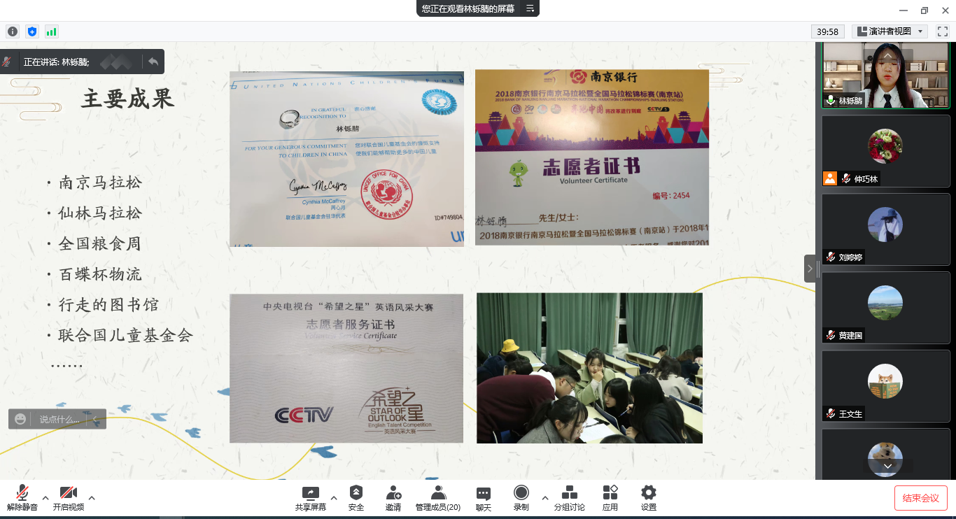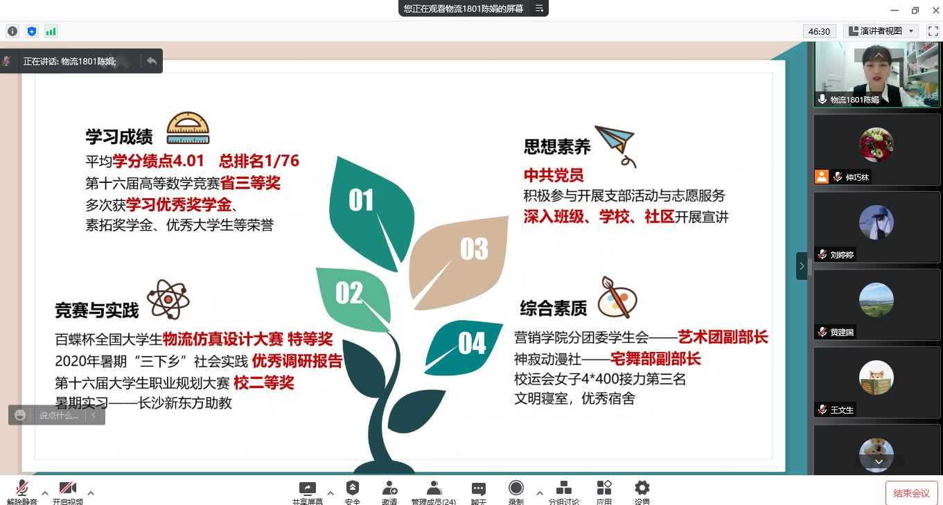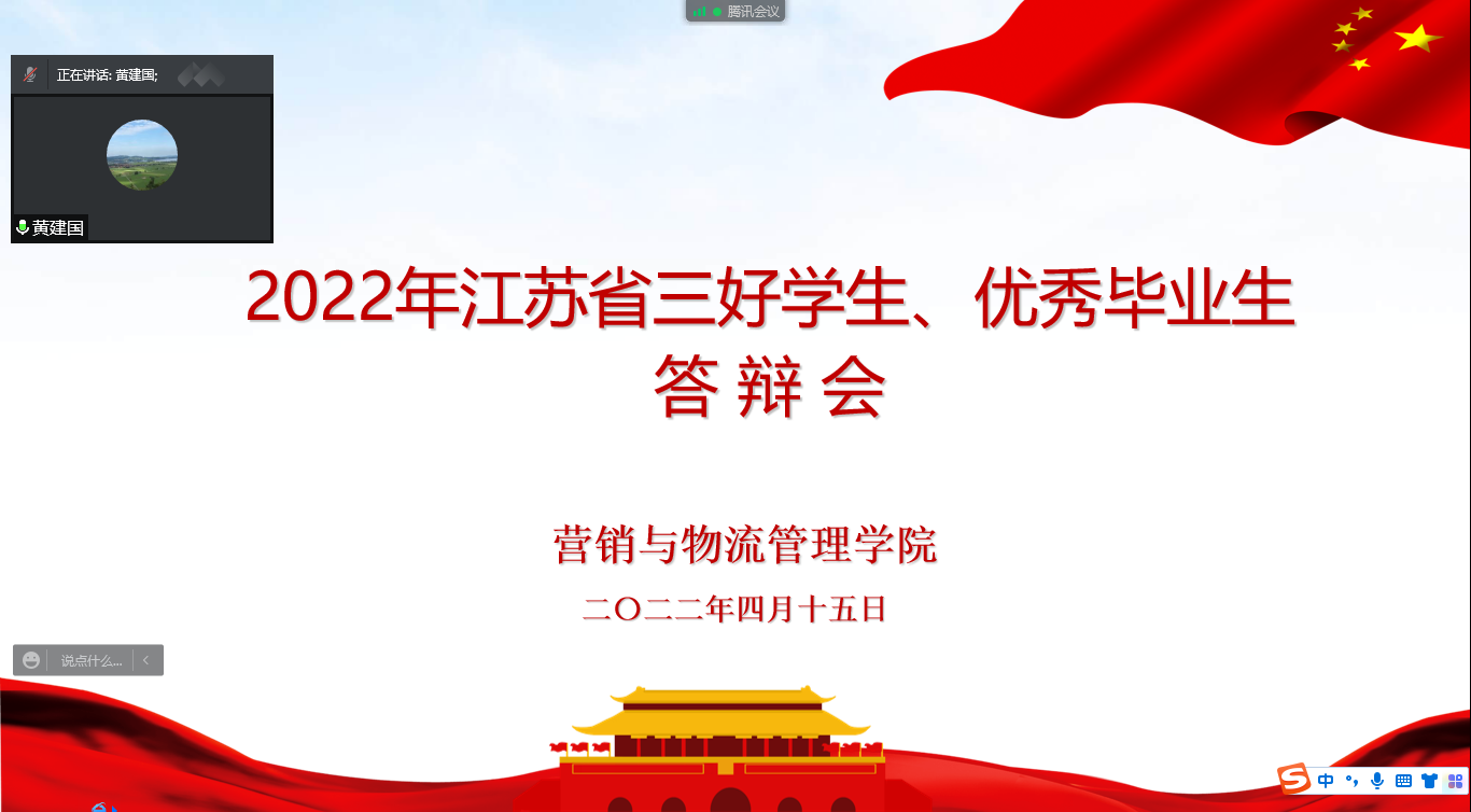 公司拟推荐江苏省三好员工1名、优秀毕业生1名。经前期个人申请、辅导员初评,共8名候选人进入线上答辩。答辩会上,同学结合精心制作的PPT详细进行了自我介绍,讲述入学以来在专业学习、学科竞赛、科研创新、志愿服务、社会实践等方面成绩,并分享了自己对生活的思考以及未来的展望。整个答辩过程充分展现了营管学子乐观自信、自觉奋斗的青春风采,也给评委和观摩的同学留下了深刻的印象。
