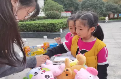 活动开始后,不断有家长、孩子被桌子上摆放着的色彩斑斓的童书所吸引。经过项目组成员的悉心介绍,小朋友们纷纷回家整理出闲置书籍,来中心广场换取积分,并登记在存折上。小朋友再挑选出自己想看的书,在存折上扣除相应积分。当然,对于第一次来的小朋友,现场的项目组成员也会帮助其开设账户,以便其积分并兑换奖品书籍。