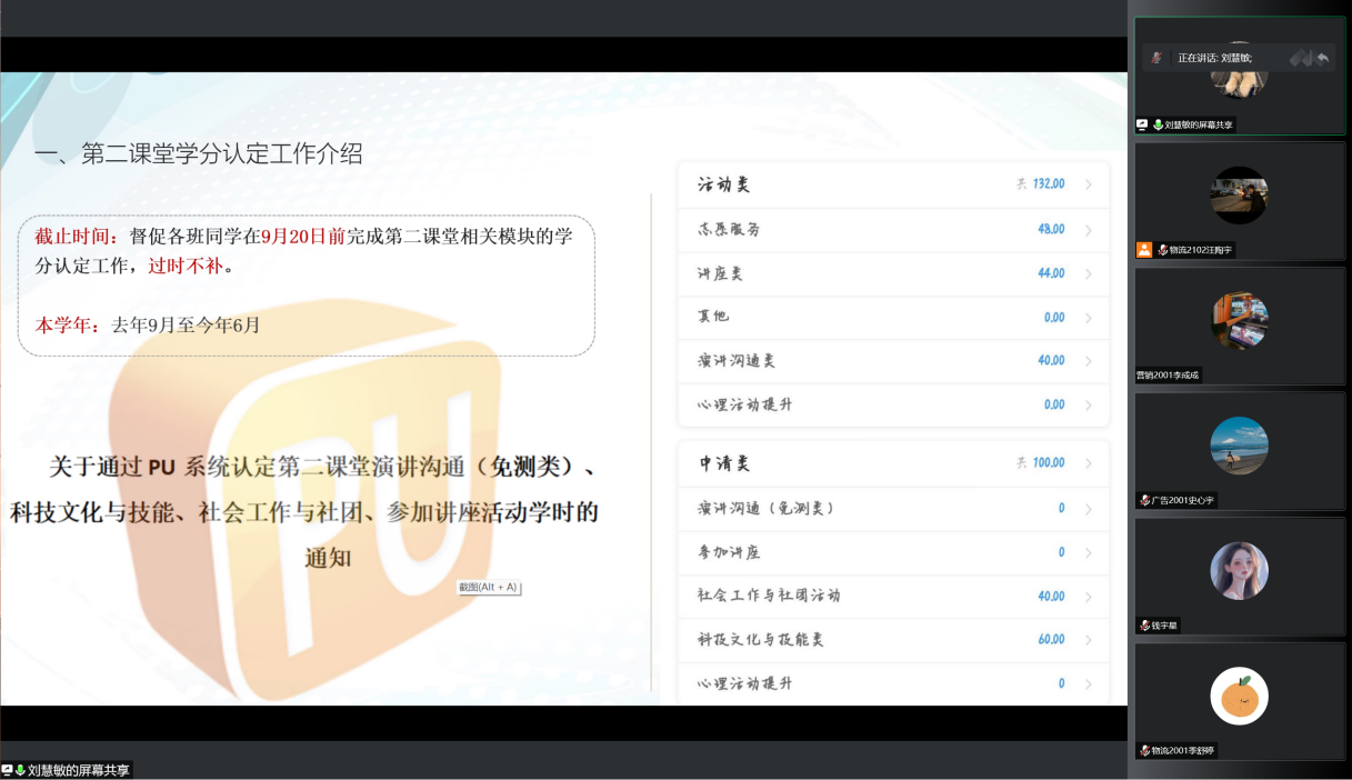 Pu培训会从主持人宣讲和会后答疑两个部分展开。10月29日晚18:00,培训会正式开始,主持人向各位团支书介绍了pu的作用以及使用方法、pu团支部端工作的具体要求以及第二课堂学分认定相关工作。随后,主持人对团支书给各项问题进行答疑并对班级pu培训会提出要求。