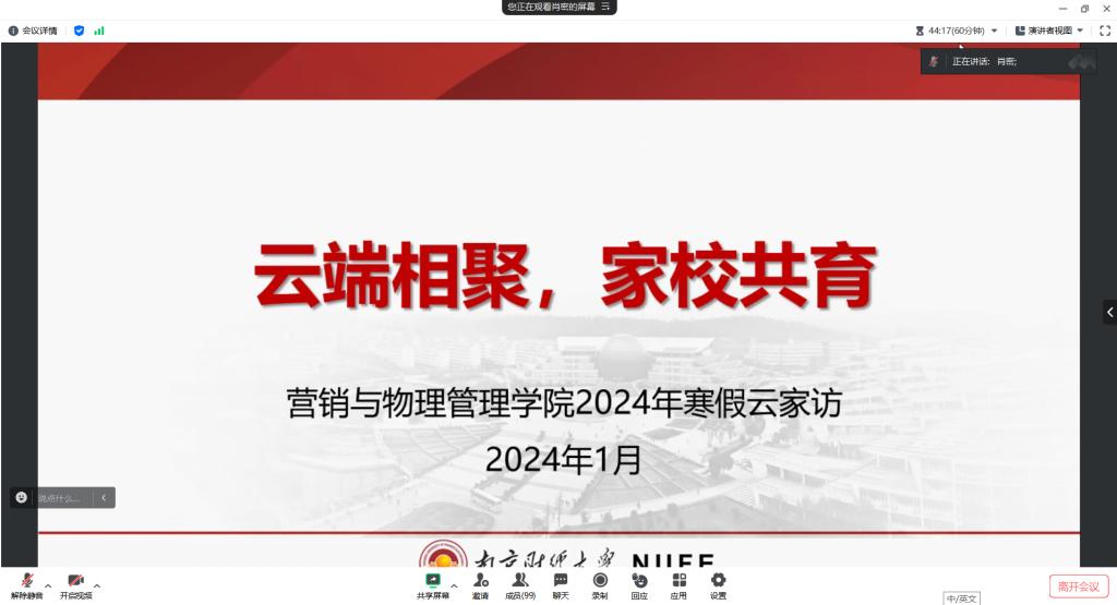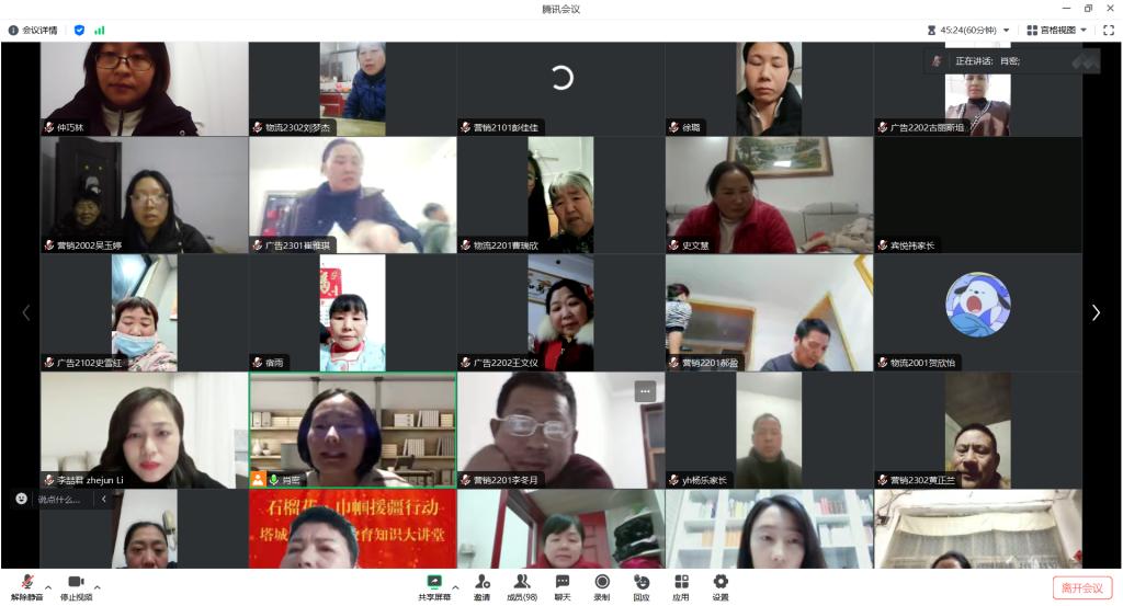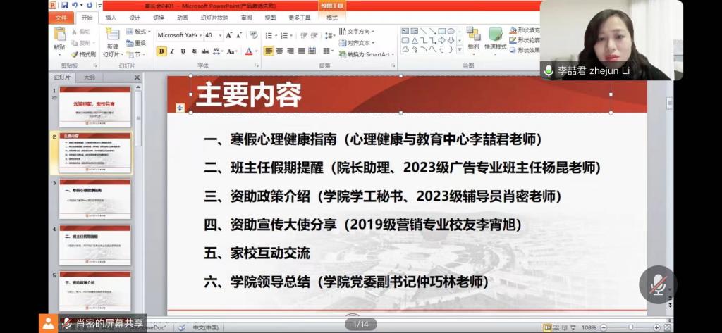 为持续凝聚育人合力,宣传国家资助政策,增强资助育人实效,1月28日晚,公司召开2024年寒假家庭经济困难员工线上家长会。公司党委副书记仲巧林老师,校心理健康与教育中心李喆君老师,公司经理助理、2023级广告专业班主任杨昆老师,辅导员肖密、殷漫漫、徐辉、徐璐老师,2019级营销专业员工李宵旭同学,以及公司全体家庭经济困难员工和家长共同参会。会议由学工办主任肖密老师主持。