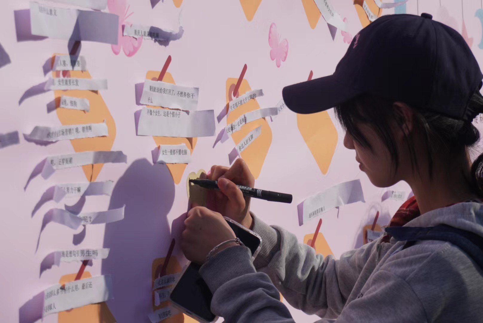 志愿者们为参与的同学们讲解了此次活动主题、内容及意义。现场的同学们积极互动,从展板上撕除自己最不喜欢的一项标签,并写下想表达的正能量话语或分享的个人经历,张贴至立板上。志愿者们还在立板背面设置“创意签到”区,让参与活动的同学写下自己的名字或代表自己的正面形象。撕标签、破偏见、寄真情,同学们用实际行动表达了要有勇气做自己,做一个不被定义的人,爱自己才是最好的。参与活动的同学均获得钥匙扣和一支鲜花作为奖品。