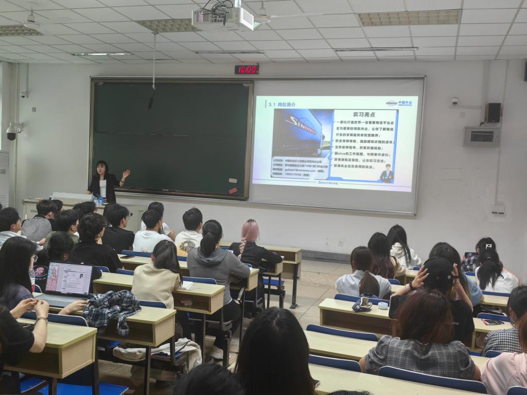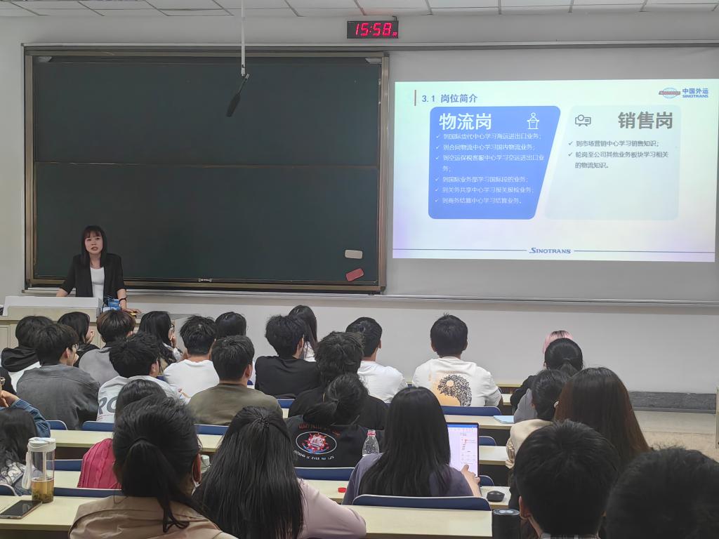 中国外运长江有限公司苏州分公司人力资源部招聘专员顾欢首先对公司的发展历程、组织架构、主营业务等作了详细介绍,帮助同学们了解公司的基本情况。随后她对本次招聘的物流岗位、销售岗位的工作内容、工作地点、培训时间、薪资待遇、人员要求等情况做了详细说明,她强调公司采用“双导师制”,意味着同学们在工作和实习中可以获得两位具备丰富经验的导师的直接指导和培训,帮助同学们积累实操经验、提升工作技能。
