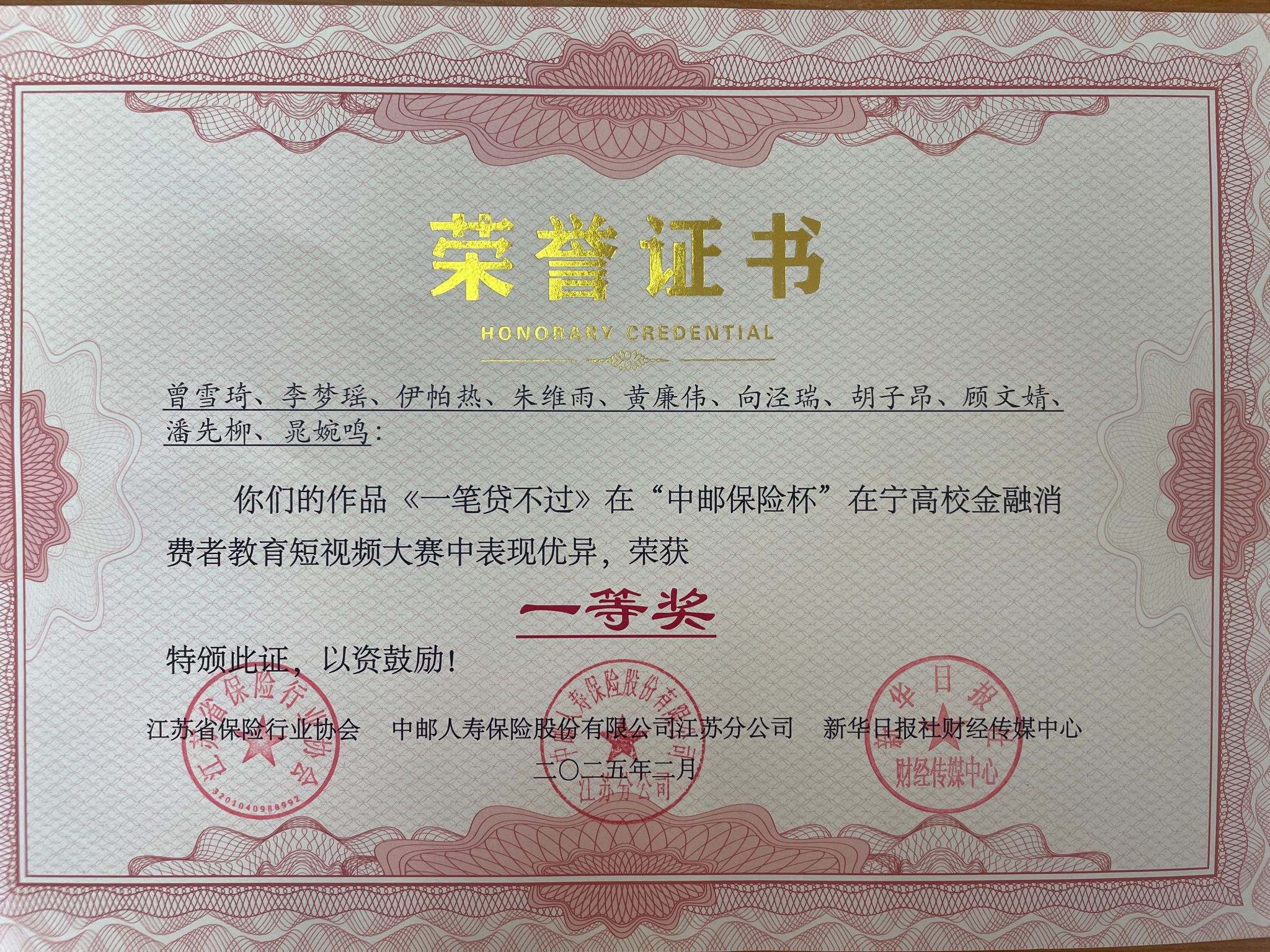 近日,2024年“中邮保险杯”在宁高校金融消费者教育短视频大赛结果揭晓。本次赛事由江苏省保险行业协会主办,中邮保险江苏分公司承办,新华日报社财经传媒中心、中国邮政集团有限公司南京市分公司协办。本次大赛以“数字时代的金融消费者权益保护”为主题,历时三个月,经过赛事启动、作品征集、专家评审三个阶段,最终评出一等奖1名、二等奖3名、三等奖10名、优秀奖若干。