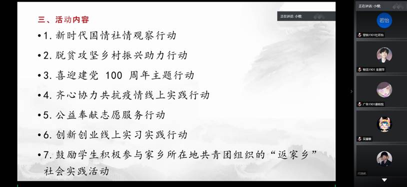 为提升同学们参加暑期社会实践的积极性,7月4日下午,公司于腾讯会议举行了2020年暑期社会实践动员大会,公司分团委书记殷漫漫和2019级同学参加了会议。