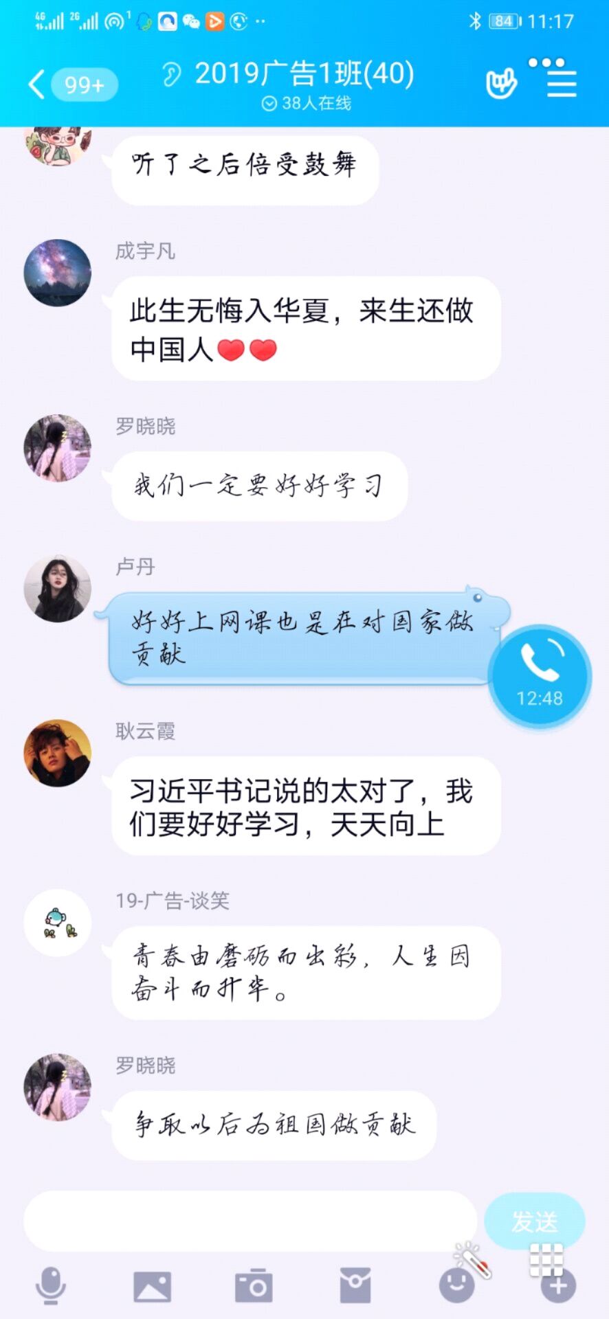 5月7日晚青年团干线上研讨会在腾讯课堂上开展。首先,研讨会主持人营销1901何小琳同学带领参会成员学习和解读习近平总书记对青年人的寄语。接着,优干主讲人广告1802卞倩对娄书记寄语和公司防疫工作中青年表现进行解读。最后,主持人带着参会人员一起重温了习近平总书记对青年的赞扬。会议期间,优秀团员、团干积极发言,交流互动,气氛热烈。此次研讨会中,优秀团员、团干认真学习并深刻体会到了习近平总书记和娄书记对青年的寄语精神,感受到了肩上的重担,并决心努力奋斗,展望未来。