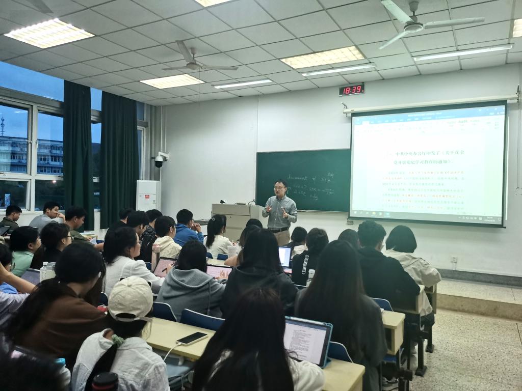 首先,徐刚老师以《中国共产党纪律处分条例》(以下简称《条例》)为切入点,从什么是纪律建设、如何开展党纪学习教育讲起,带领同学们共同学习党的纪律的相关内容。他结合纪律建设的百年历程和经验启示,通过丰富的案例、精彩的互动,深入浅出地向同学们阐述了党的百年纪律建设历程,进一步让大家认识到党的纪律建设是党从小到大、从弱到强、不断从胜利走向胜利的坚强保障。他希望同学们牢记习近平总书记的殷切期望,把纪律建设摆在突出位置,经常进行自我政治体检,拿党章党规“扫描”,始终做到初心如磐、使命在肩。
